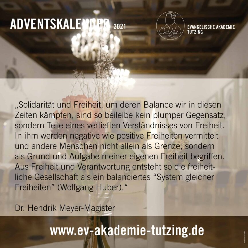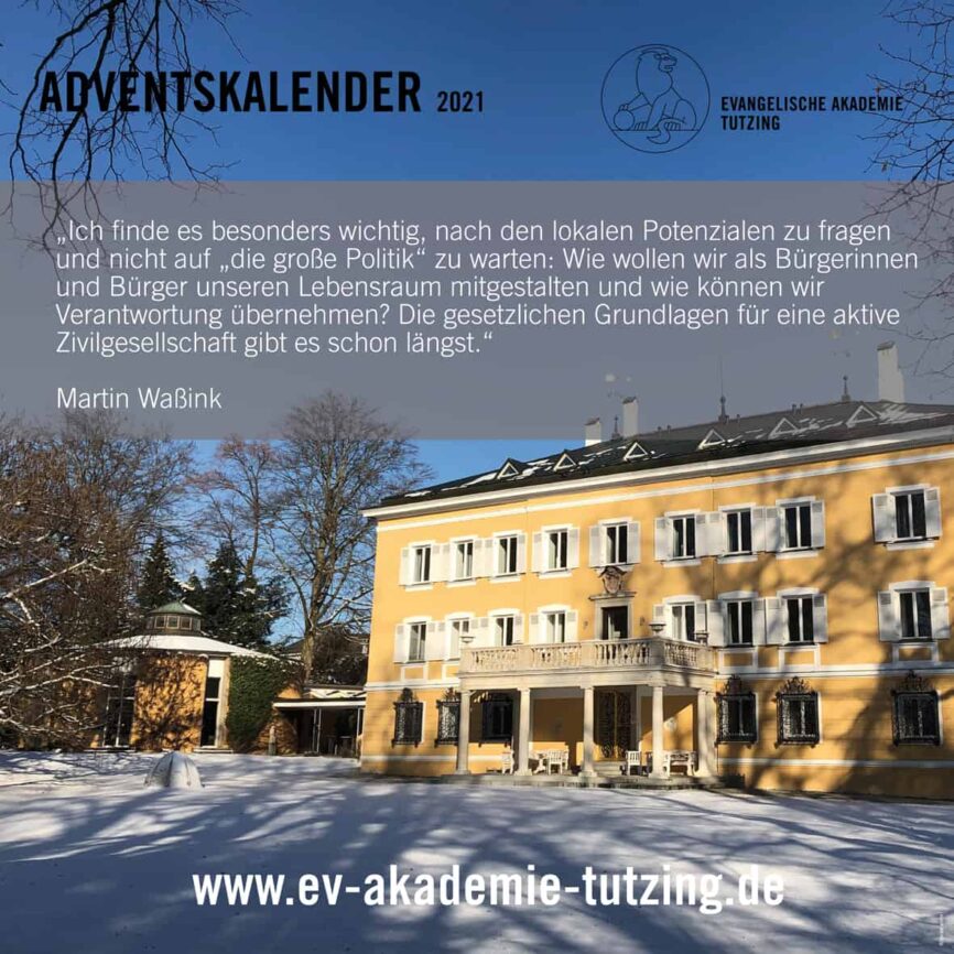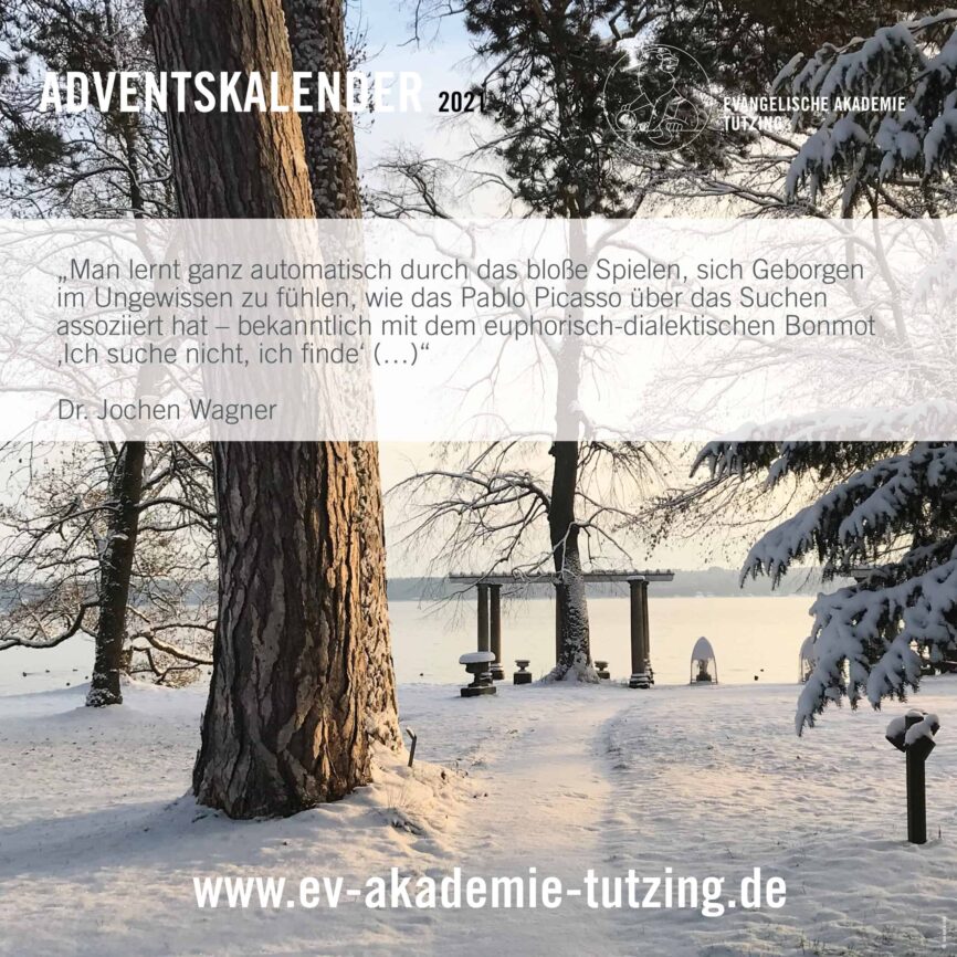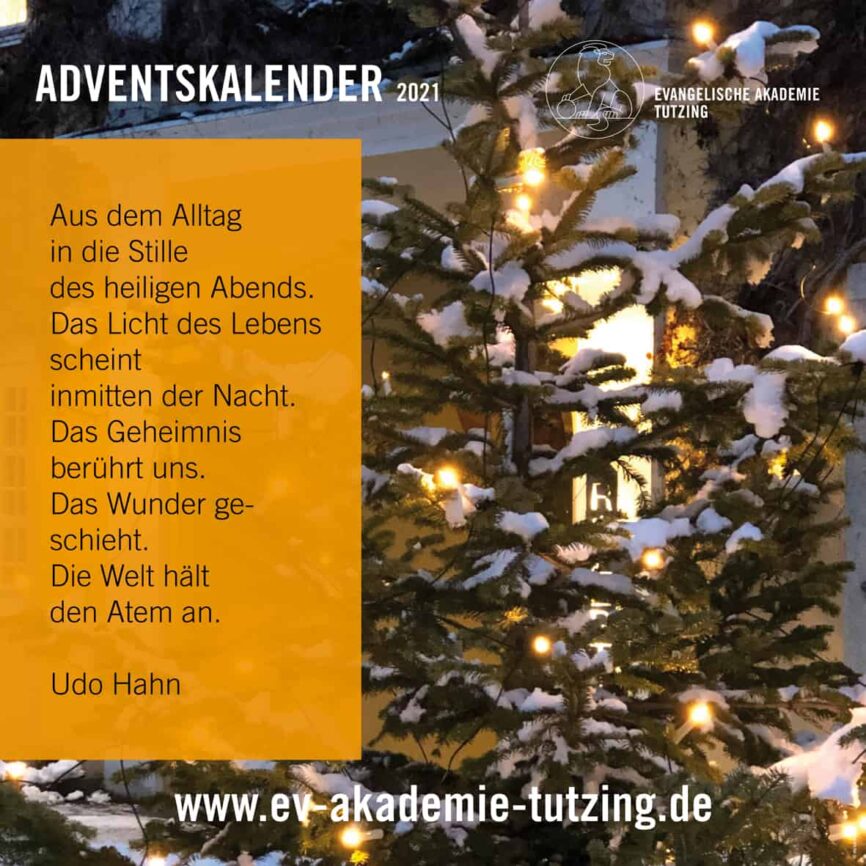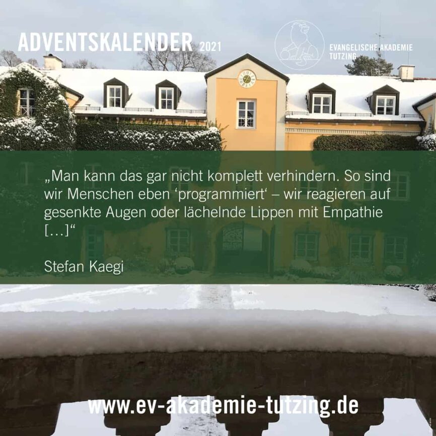 Vom 1. bis zum 24. Dezember können Sie auf unseren Facebook- und Instagram-Kanälen jeden Morgen ein virtuelles Türchen öffnen und so einen kleinen Adventsmoment aus der Evangelischen Akademie Tutzing erleben. Abonnieren Sie dazu einfach unsere Kanäle – kostenlos: https://www.facebook.com/EATutzing und https://www.instagram.com/eatutzing .