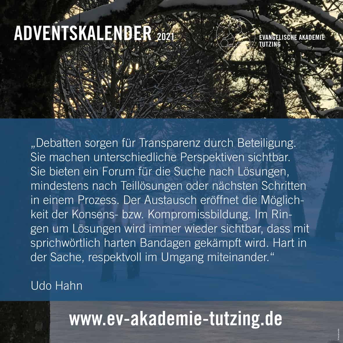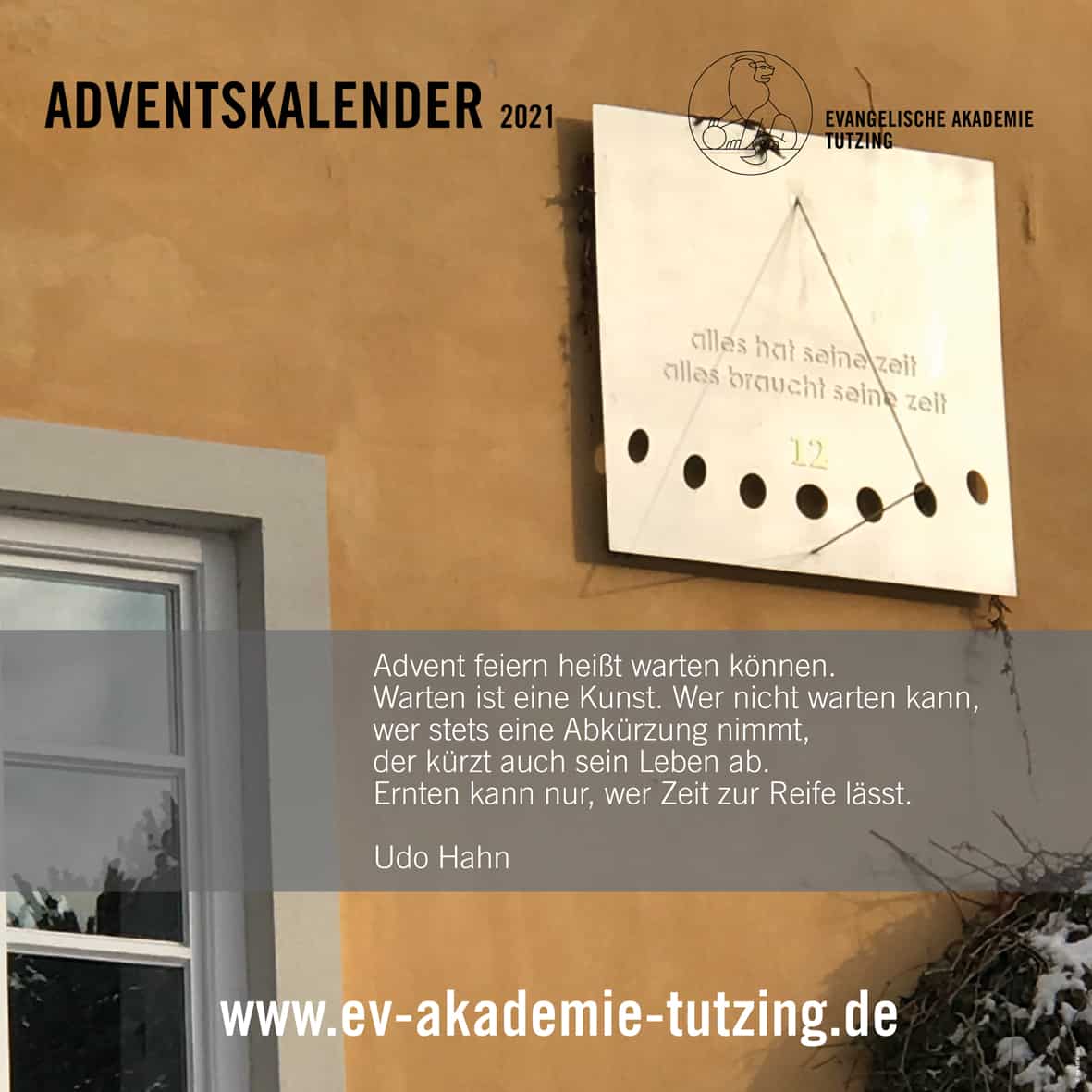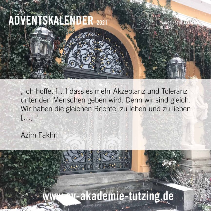 Vom 1. bis zum 24. Dezember können Sie auf unseren Facebook- und Instagram-Kanälen jeden Morgen ein virtuelles Türchen öffnen und so einen kleinen Adventsmoment aus der Evangelischen Akademie Tutzing erleben. Abonnieren Sie dazu einfach unsere Kanäle – kostenlos: https://www.facebook.com/EATutzing und https://www.instagram.com/eatutzing .