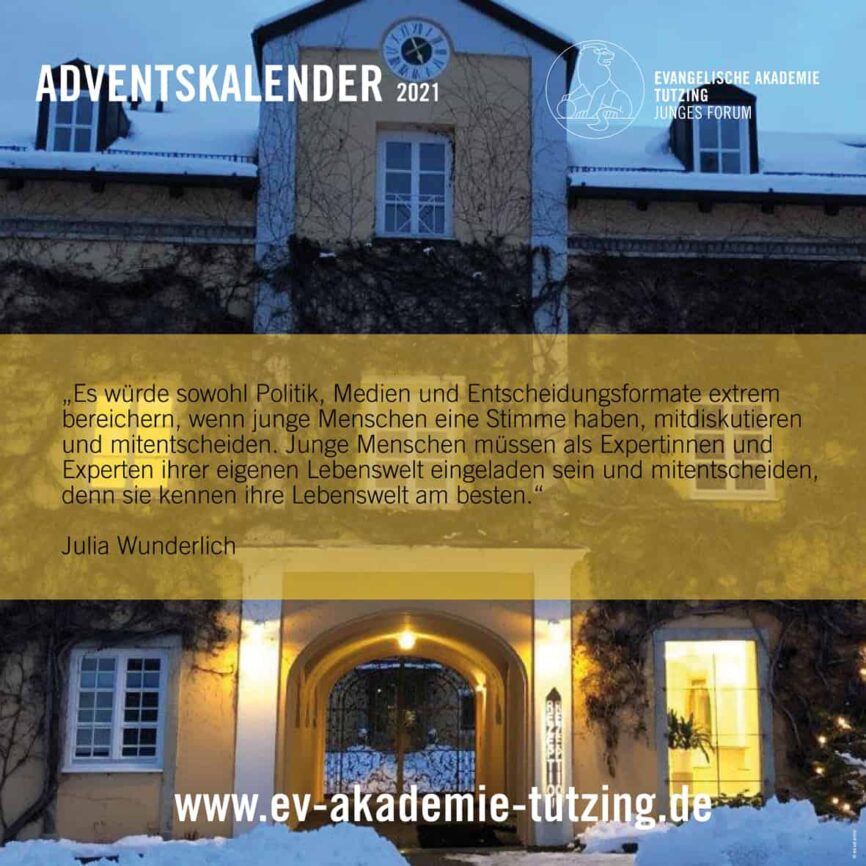4. DEZEMBER4 / 24Julia Wunderlich, Studienleiterin für das „Junge Forum“ an der Evangelischen Akademie Tutzing sprach im Interview im März über ihr Vertrauen in und ihre Hoffnung auf junge Menschen und deren Fähigkeiten. -