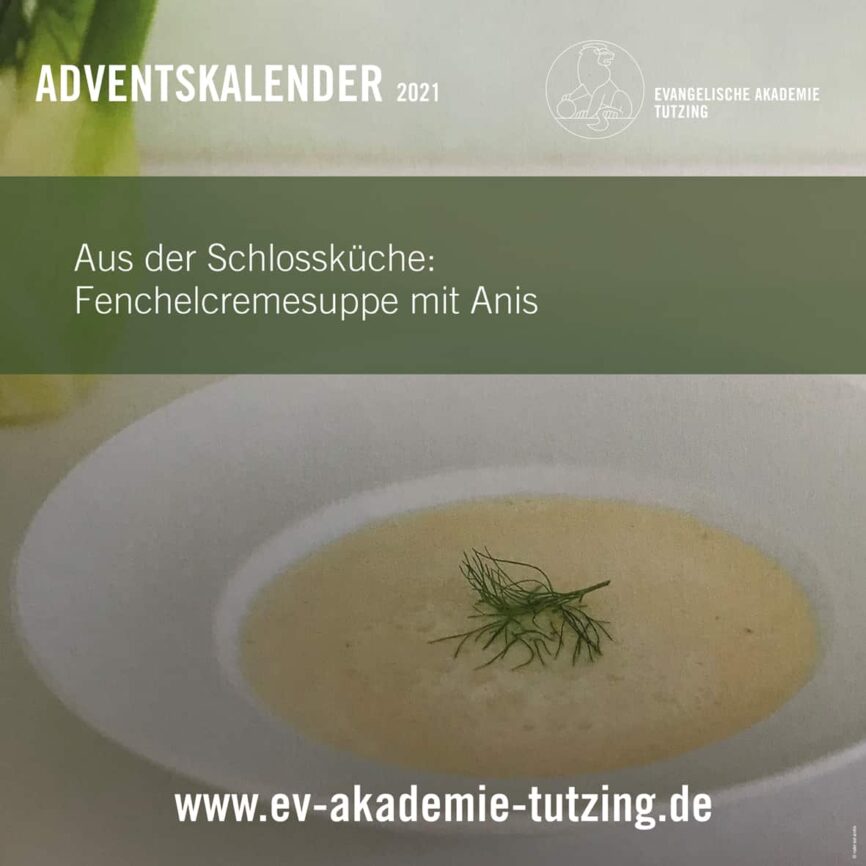 7. DEZEMBERAus der Schlossküche: Fenchelcremesuppe mit AnisZutaten:• 300g Fenchel• Eine Zwiebel• Ein kleines Stück Petersilienwurzel• 30g Butter• 500ml Fleisch- oder Gemüsebrühe• 100g Sahne• ½ TL Aniskörner (im Mörser zerstoßen) – alternativ: ein Schuss Pernod• Salz und PfefferZubereitung:1. Die Zwiebel und die Petersilienwurzel schälen und in feine Würfel schneiden. Den Fenchel putzen und ebenfalls würfeln. Das Fenchelgrün zur Seite legen.2. In einem Topf die Butter erhitzen und die Zwiebelwürfel darin glasig dünsten. Fenchel- und Petersilienwurzelstücke sowie zerstoßene Aniskörner zugeben und ungefähr zwei Minuten mitrösten,3. Mit der kalten Brühe auffüllen und zum Kochen bringen. So lange bei schwacher Hitze köcheln lassen, bis das Gemüse weich ist.4. Die Fenchelsuppe mit dem Mixstab fein pürieren. Dabei die Sahne zugeben. Mit Salz, Pfeffer abschmecken. (Wer mag, kann mit einem Schuss Pernod abschmecken.) Mit dem gehackten Fenchelgrün bestreuen und servieren.7 / 24 -