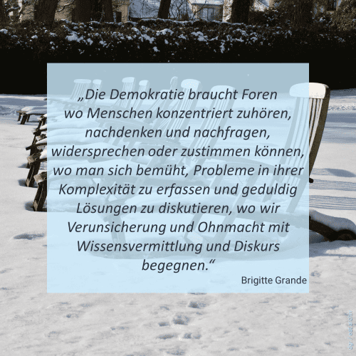 Das Zitat stammt aus der Rede von Brigitte Grande anlässlich der Verleihung des Freundeskreiszeichens an Akademiedirektor Udo Hahn im Februar 2025.