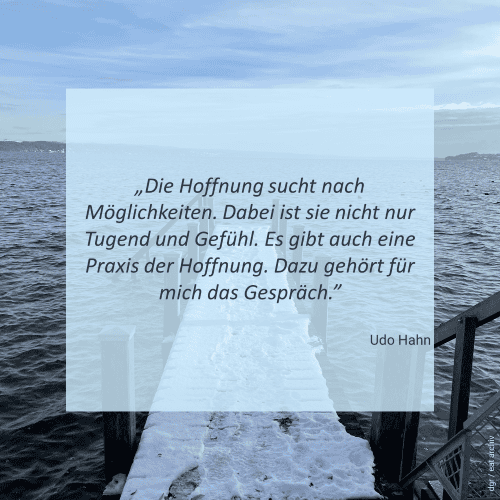 Akademiedirektor Udo Hahn nutzte diese Gedanken und Formulierungen des Theologen Jürgen Moltmann in seiner Dankesrede im Februar 2025. Anlass war die Auszeichnung und Ehrung Udo Hahns mit dem „Freundeskreiszeichen“ des Freundeskreises der Evangelischen Akademie Tutzing für 40 Jahre Bildungsengagement.