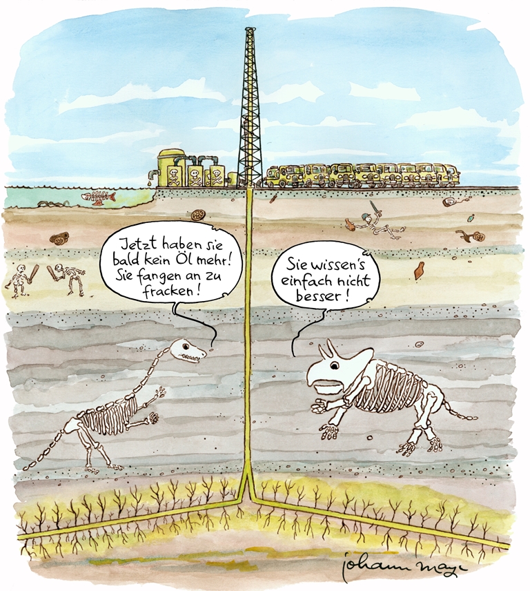 Unser Cartoonist, Johann Mayr, hat den fossilen Rückblick auf das Jahr 2013 passend zum Hype ums Fracking ins Bild gesetzt (ein Klick auf das Bild führt zur vergrößerten Ansicht).