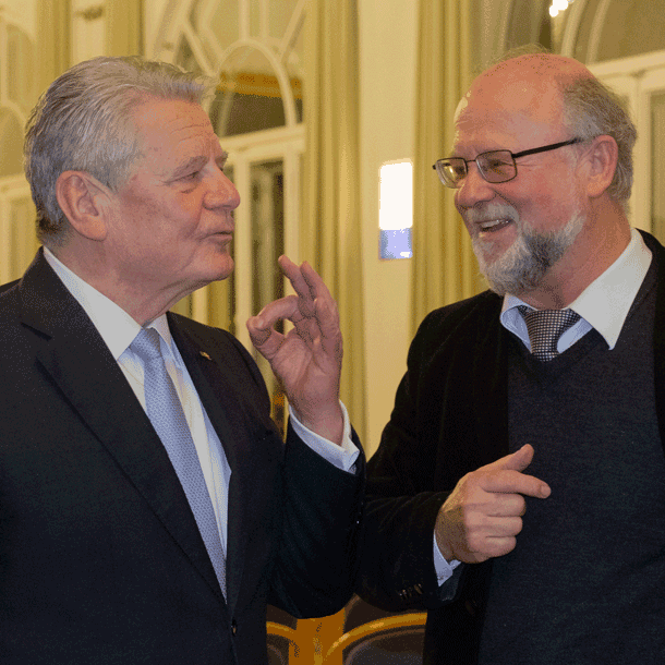 Dies war der Kernpunkt, an dem sich sowohl seine Dankesrede als auch das anschließende Gespräch mit Akademiedirektor Udo Hahn ausrichtete. Mit den „Verschiedenen“ meinte Gauck nicht nur Menschen aus verschiedenen Ländern, sondern vor allem auch Menschen, die sich nicht gehört fühlen, denen der technische Fortschritt zu schnell gehe oder die sich schlichtweg nicht zugehörig fühlten zu den „vorgeblich besseren Kreisen“. Es gebe diejenigen, die vor Neuerungen Angst haben und die anderen, die Neues als Bereicherung empfänden. Oft, so Gauck, seien es diejenigen, die sich als nicht gehört empfänden, denen der Fortschritt in der modernen Welt zu schnell ginge, die sich abgehängt fühlten und die sich nicht mehr trauten, Fragen und Sorgen öffentlich zu äußern, weil sie befürchten, abgestempelt zu werden.