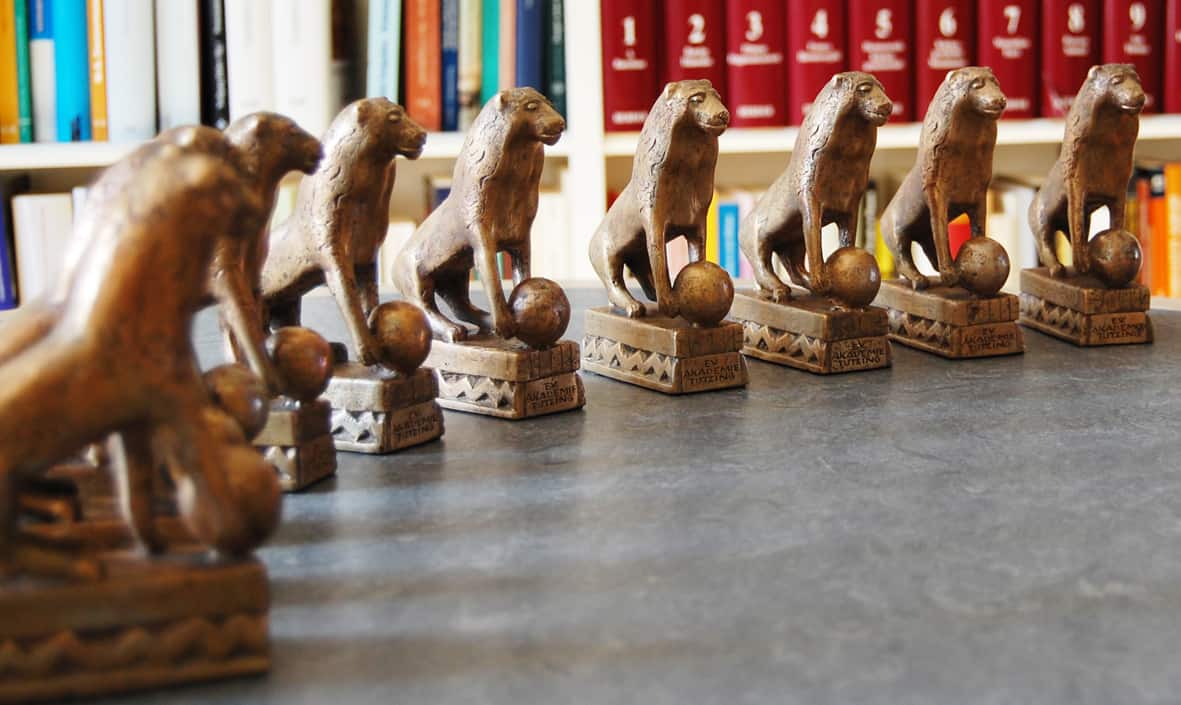 Geschaffen wurde das Tutzinger Wappentier von dem mittlerweile verstorbenen Künstler Karlheinz Hoffmann. Ihm verdankt die Akademie auch das große schmiedeeiserne Haupttor des Tutzinger Schlosses. Sein Sohn, Simon Hoffmann, überreichte heute nun 10 weitere Tutzinger Löwen an Akademiedirektor Udo Hahn, der sich mit den Worten bedankte: „Wir wollen mit dem Tutzinger Löwen auch weiterhin Menschen auszeichnen, die in besonderer Weise die beiden Tugenden Toleranz und Weltoffenheit verkörpern.“ Zu diesen Persönlichkeiten gehörten bislang das Ehrenoberhaupt der weltweiten Orthodoxie, Bartholomaios I., sowie die Politiker Helmut Kohl, Egon Bahr und Hildegard Hamm-Brücher. Mit dem Tutzinger Löwen ausgezeichnet wurden ebenfalls der Philosoph Carl-Friedrich von Weizsäcker, der Intendant des Bayerischen Rundfunks, Ulrich Wilhelm, als auch die beiden bayerischen Landesbischöfe Hermann von Loewenich und Johannes Friedrich.