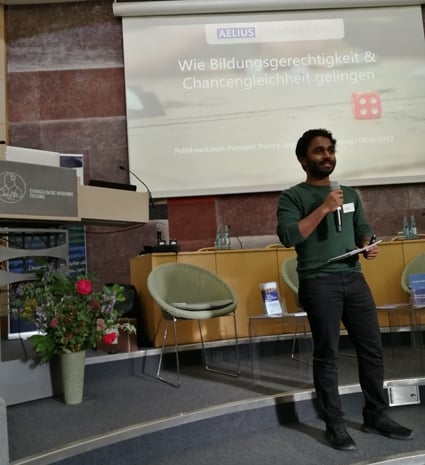 Sagithjan Surendra stellte das von ihm gegründete Aelius Förderwerk vor. Er stellte klare Forderungen zur Reformation des Bildungssystems vor. Dieses System reproduziere soziale Ungleichheit: Ziel jeder Bildungsreform müsse die Kompensation sozialer Benachteiligung sein. Surendra sieht großes Potenzial in Angeboten der offenen Ganztagsbetreuung. Vor allem auch das Abschaffen des mehrgliedrigen Schulsystems würde der Bildungsgerechtigkeit und Chancengleichheit dienen können. Denn noch immer sind soziale Mobilität und Bildungsaufstiege benachteiligter junger Menschen in Deutschland sehr schwer, also zum Beispiel der Wechsel zwischen den Schulformen. Auch die finanziellen Aspekte der Teilhabe aller machte Surendra sichtbar an Beispielen, etwa, wer sich ohne Probleme Studienfahrten oder Musikunterricht leisten könne – und wer nicht.