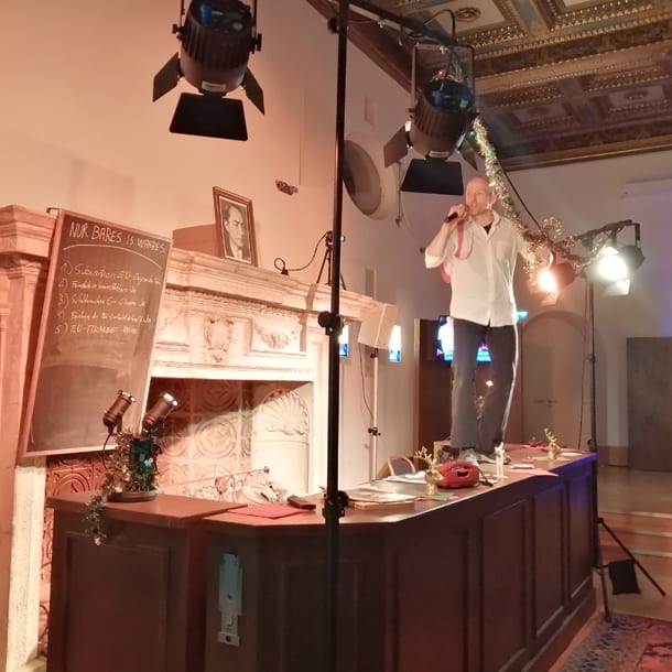Im abendlichen interaktiven Theater „Was wäre, wenn die EU eine Kneipe wäre?“ war das Tagungspublikum Teil des Theaters. Das Planspiel des Brachland Ensembles in Koproduktion u.a. mit dem Theater Aachen & der Landeszentrale für politische Bildung NRW simulierte Abstimmungsprozesse des EU-Parlaments. In verschiedenen Rollen wurde im Theaterspiel politische Prozesse nachempfunden.