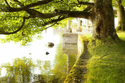 Die einmalige Lage am Ufer des Starnberger Sees und die weitläufigen Anlagen mit ihrem jahrhundertealten Baumbestand machen den Schlosspark zu einem einzigartigen Naturdenkmal. Der ehemals barocke Schlossgarten wurde 1802 bei dem groß angelegten Neubau des Schlosses unter Friedrich Graf von Vieregg in einen englischen Landschaftsgarten umgewandelt, der allerdings an einer Mauer endete und noch nicht bis zum See reichte. Der Uferstreifen konnte erst 1870 von Eduard von Hallberger in den Park einbezogen werden. Für die Umgestaltung der Gartenanlage wurde der bayerische Hofgartendirektor Karl von Effner engagiert. Er schuf auf dem beschränkten Raum eine weiträumig wirkende Parkszenerie. Der benachbarte Kustermannpark wurde zur gleichen Zeit ebenso nach von Effners Entwürfen im Auftrag von Max Kustermann, einem wohlhabenden Tutzinger Industriellen, gestaltet. Mit Blick auf die malerische Alpenkulisse von Karwendel, Wetterstein und Zugspitze reiht sich der Schlosspark der Evangelischen Akademie Tutzing in die Kategorie der außergewöhnlichen Parkensembles am Westufer des Starnberger Sees ein.